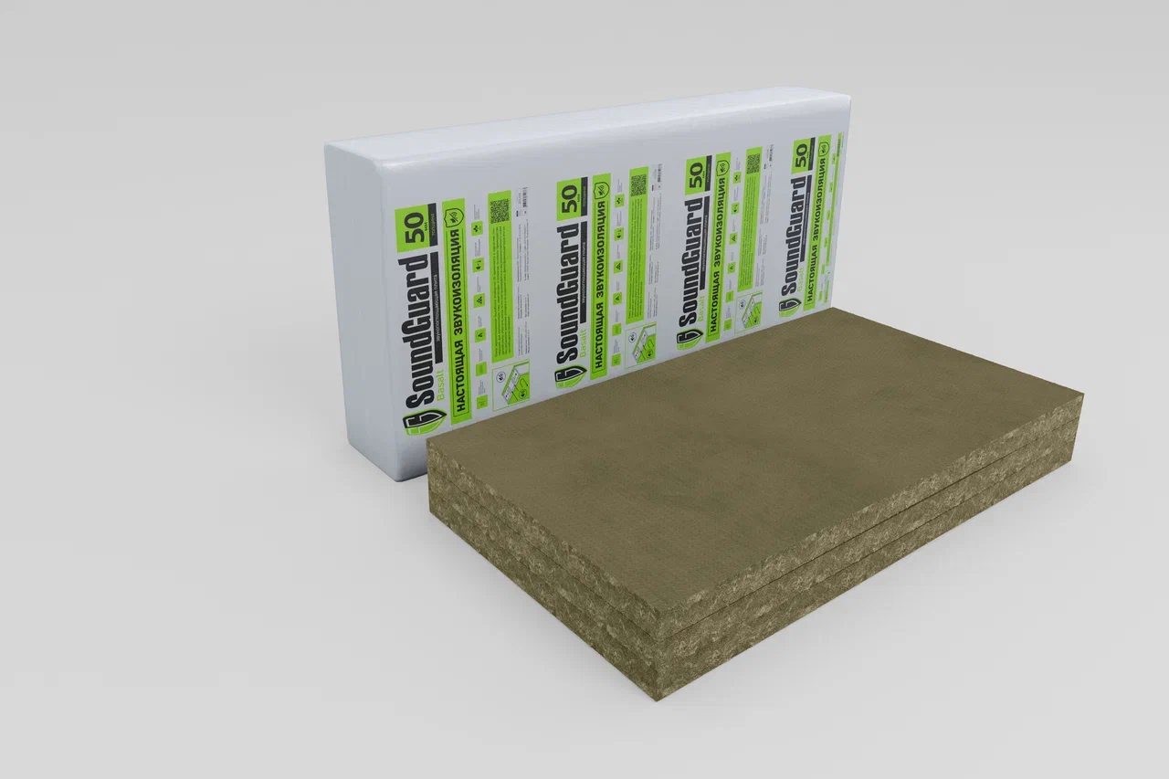 SoundGuard Basalt 50 – звукопоглощающие гидрофобизированные плиты из высококачественной каменной ваты на основе базальтовых пород. Хаотичное расположение волокон и однородная структура материала обеспечивает отличные звукопоглощающие свойства. За счёт высоких показателей поглощения звука в порах материала обеспечивается дополнительное снижение шума.